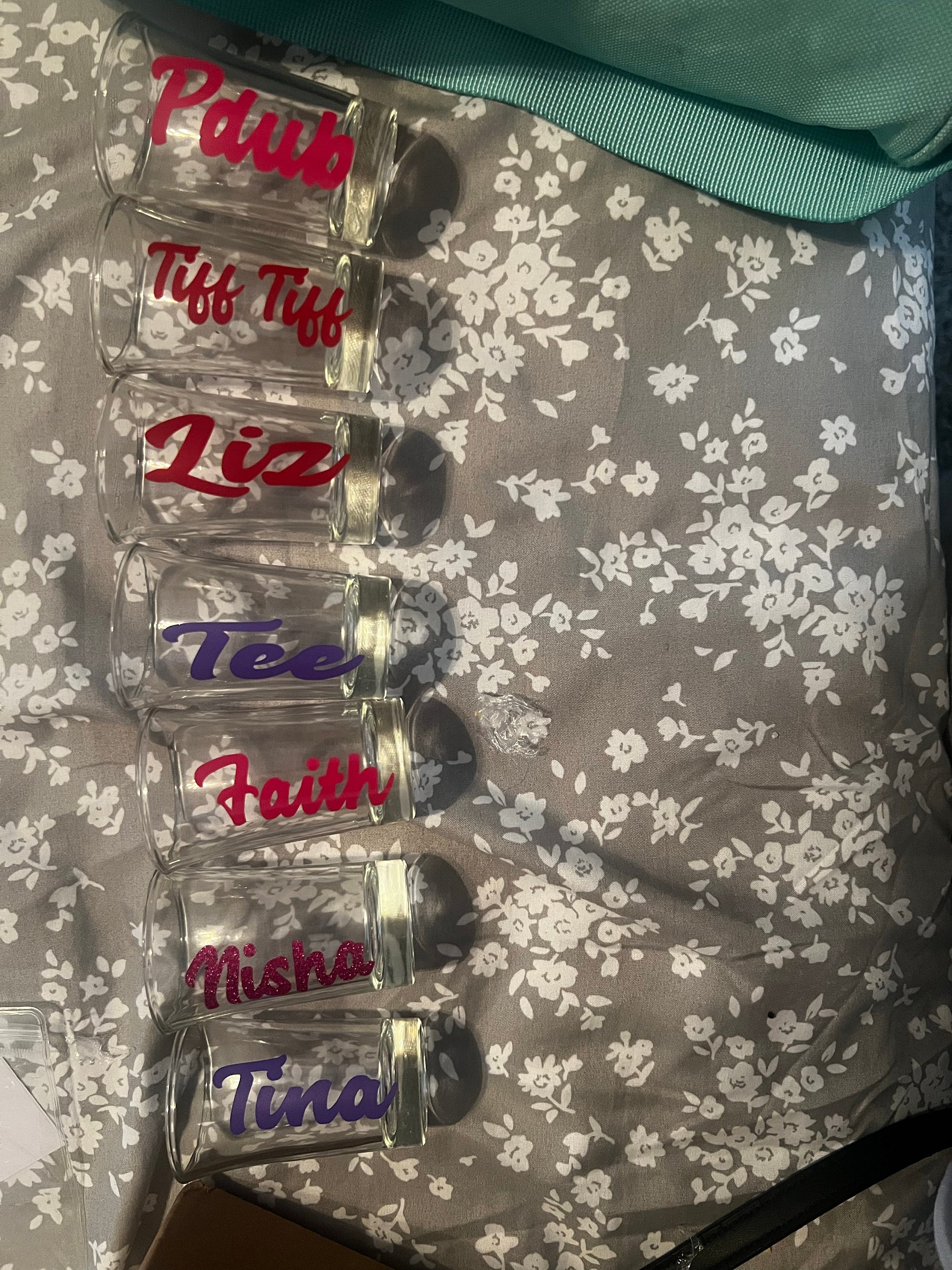 Introducing our customizable vinyl shot glasses, perfect for adding a personal touch to your favorite drinkware collection! Made from high-quality glass, these shot glasses are expertly crafted to enhance your sipping experience. With the option to customize the name, these shot glasses make a thoughtful gift for birthdays, weddings, or any special occasion. Whether you're hosting a gathering or simply enjoying a nightcap, our custom name vinyl shot glasses are sure to impress your guests with their unique design. Cheers to unforgettable moments with these personalized shot glasses!