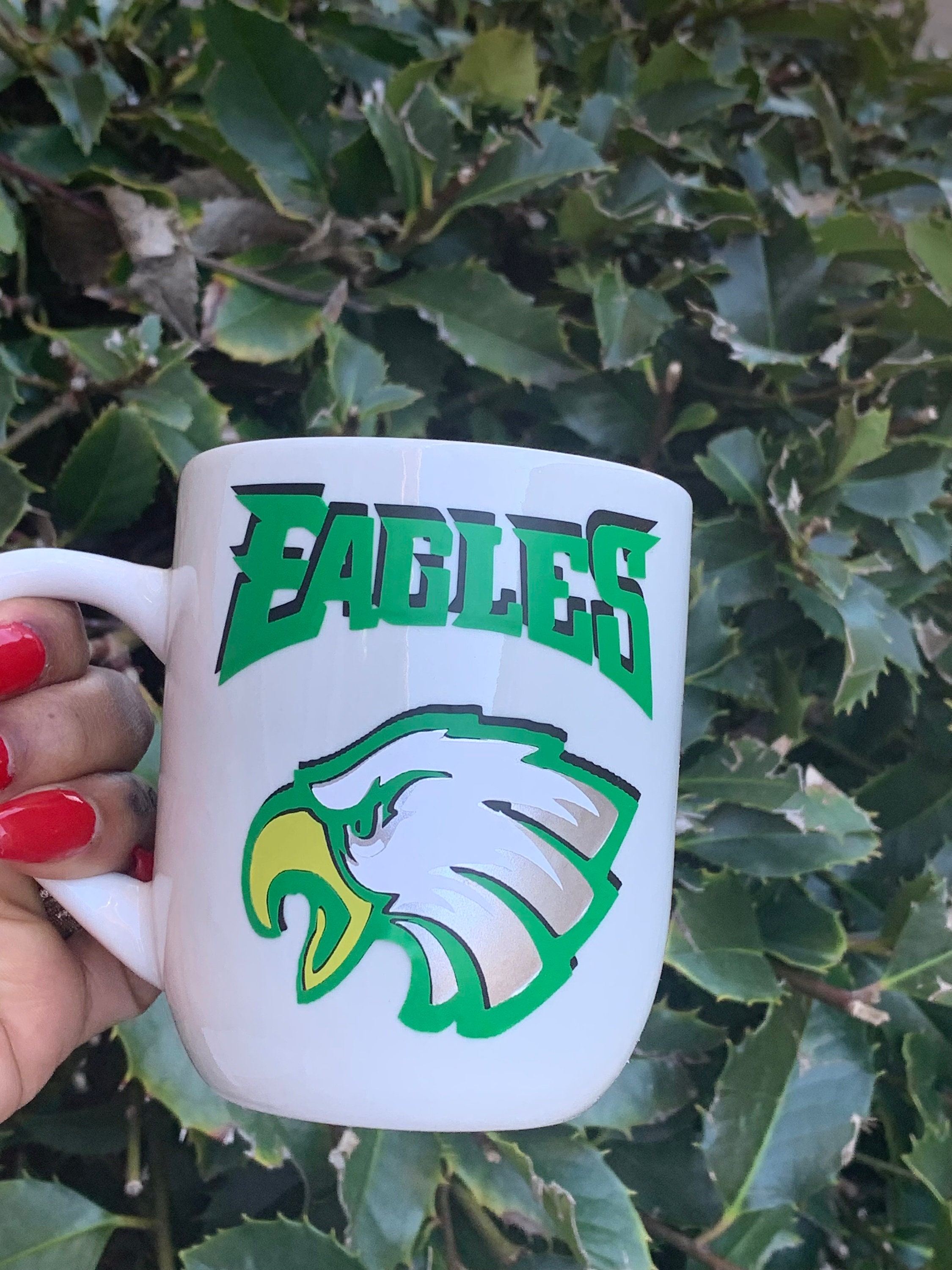 Introducing our Philadelphia Eagles Coffee Mug, the perfect addition to your morning routine! This stunning mug is expertly crafted using high-quality materials and adorned with the iconic Philadelphia Eagles logo. Made with care, each mug is meticulously designed using permanent vinyl, ensuring that the team insignia stays vibrant and intact for years to come. Whether you're enjoying a hot cup of coffee or sipping on your favorite beverage, our Philadelphia Eagles Coffee Mug will showcase your unwavering team spirit. Snag this must-have piece for yourself or surprise the Eagles fan in your life with a thoughtful gift. Get ready to show off your love for the Philadelphia Eagles with every sip!