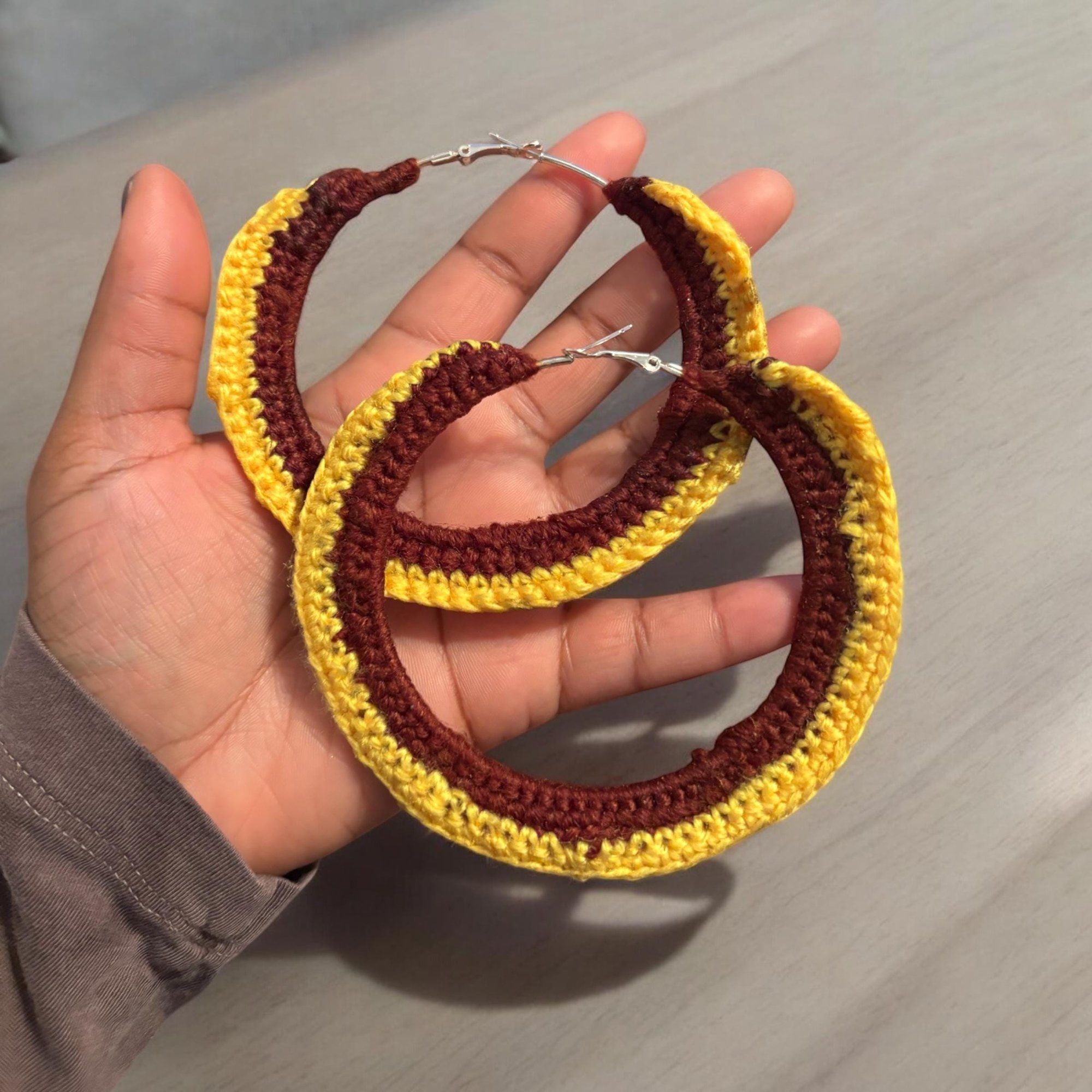 Add a pop of sunshine to your outfit with these handmade Yellow and Brown Crochet Hoop Earrings! These unique earrings are lightweight and versatile, perfect for any occasion. Elevate your style with a touch of boho chic flair. Handcrafted with love to make you stand out!